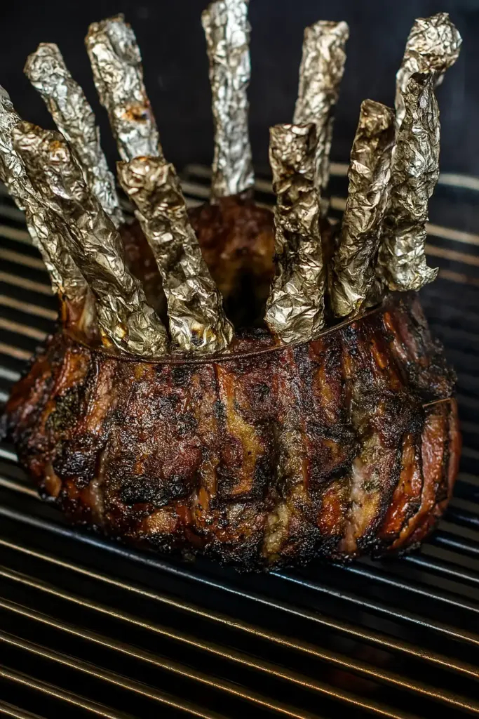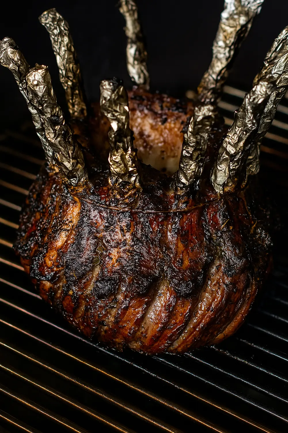 Cover the exposed rib tips with aluminum foil before roasting to prevent the bones from burning or charring, keeping them clean and white for a beautifully polished, regal presentation.