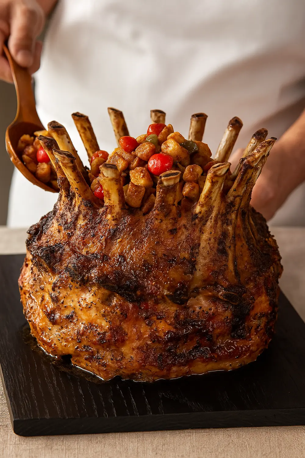 - The stuffing can be kept warm or baked separately, then added to the crown cavity just before the final sear.