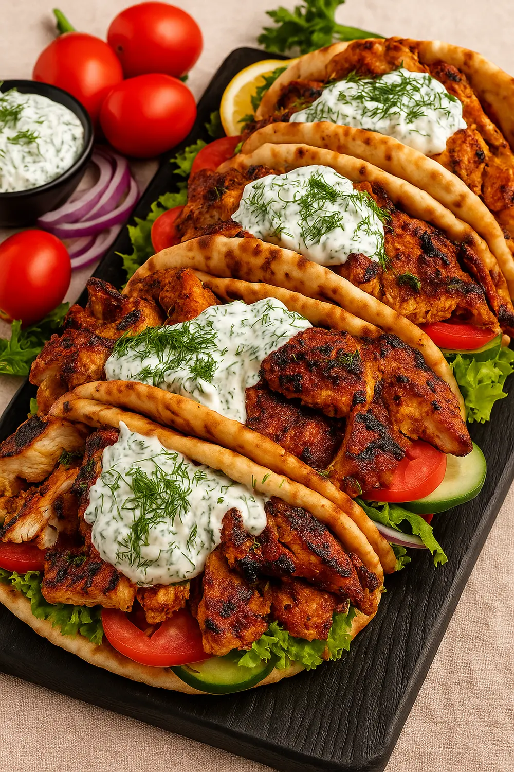 Authentic Homemade Greek Chicken Gyros Wrap with Charred Yogurt-Marinated Chicken, Crispy Vegetables, and Creamy Dill Tzatziki Sauce.